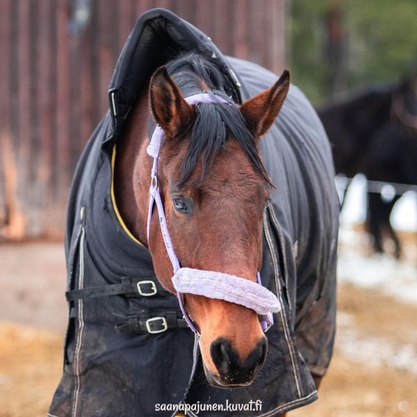 Tarvitsee selän lämmityksen ennen ratsastusta ja takajalkoihin hivutussuojat: päällimmäinen tarra osoittaa taaksepäin, kun ovat oikeissa jaloissa.